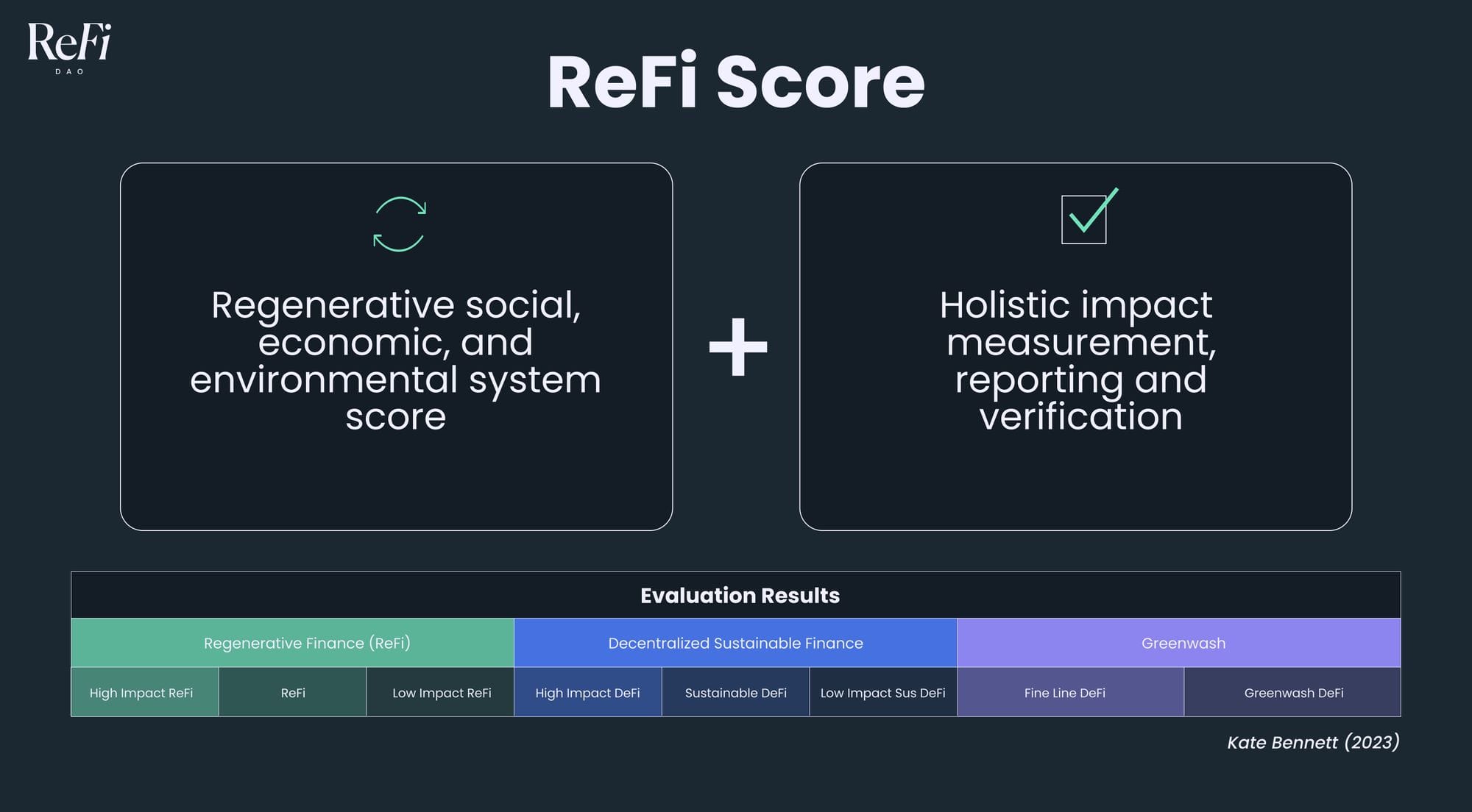 Impact Advisor & PhD researcher Kate Bennett is doing some awesome work exploring these questions. She is developing a 'ReFi Score' that aims to distinguish 'High-Impact ReFi' from 'Low-Impact DeFi' from straight up greenwashing. More on this coming soon! π