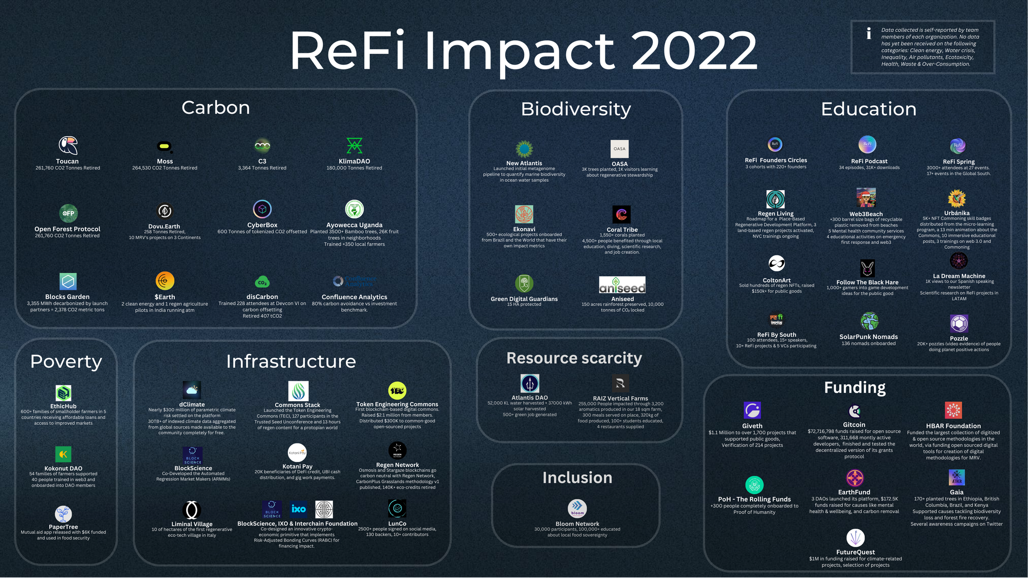 But carbon is just one part of the ReFi story. Recognising a wide array of interconnected and overlapping issues the world faces, in 2022, ReFi intentionally pushed past the “carbon tunnel vision” and embraced all manner of social, economic, and ecological values - plastic removal, community economies, ocean metagenomics, forest biodiversity, marine ecosystems, Renewable Energy Certificates (RECs), Universal Basic Income (UBI), and much more.