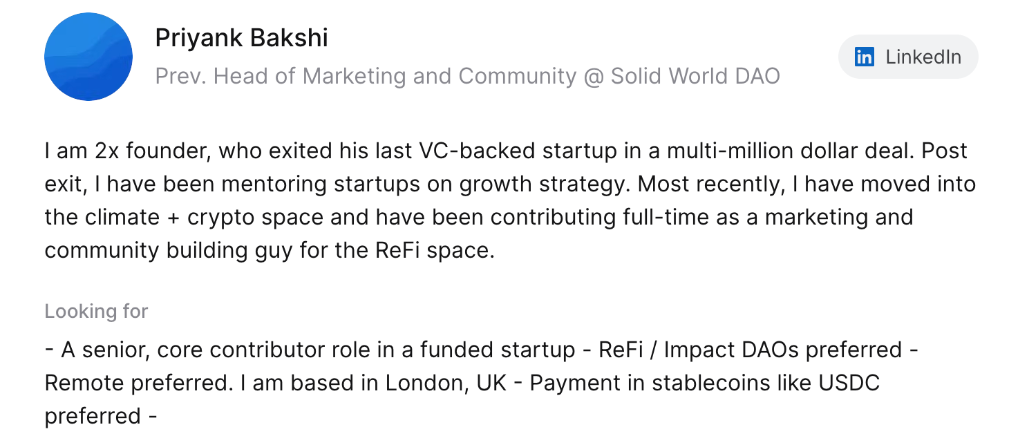 This week we've seen two entrepreneurs join the ReFi Talent collective, both of whom have received positive referrals from their previous employer at Solid World DAO. If you're growing your team, definitely reach out to Bhavesh or Priyank or apply to join our Talent Collective and we can make an intro.