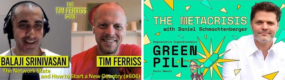 The crypto and ReFi worlds were set abuzz over the past few weeks by two deeply insightful and memetic podcast episodes: “The Network State and How to Start a New Country” featuring Balaji Srinivasan on The Tim Ferriss Show and “The Metacrisis (Part 1)” featuring Daniel Schmachtenberger on the Green Pill Podcast with Kevin Owocki.