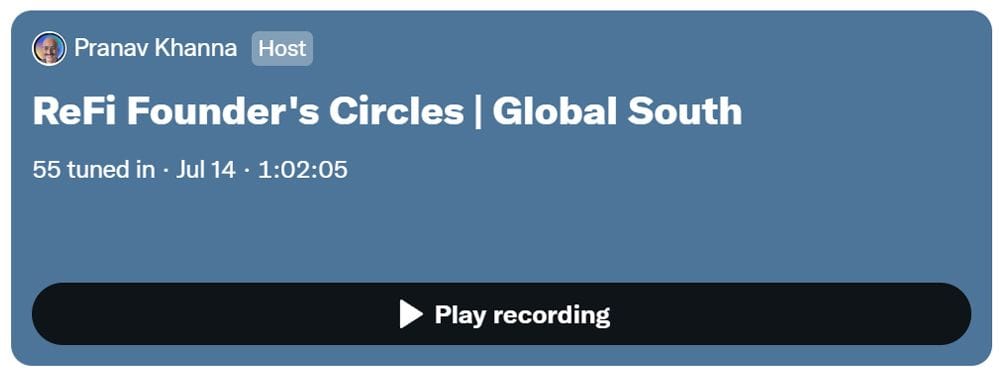 Listen to the replay of the first ReFi Summer Founders Circle (Global South) hosted by Pranav Khanna of Loa Labs.
