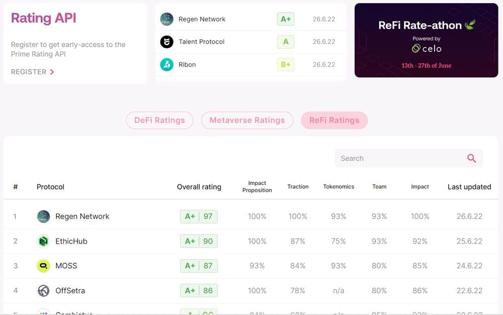 In Prime Rating's initial reports, Regen Network took the top spot amongst a solid group of A+ projects including EthicHub, MOSS, and Offsetra. A total of 17 ReFi projects were rated, meaning that while this event was a fantastic start, this is only the beginning (there are currently over 240 entries in ReFi DAO’s growing database of impact projects & initiatives!). Congratulations to all the winners and we look forward to more rating results as ReFi grows.