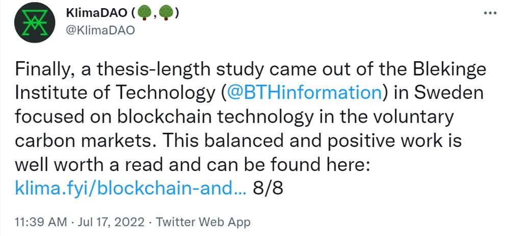 A team at Blekinge Institute of Technology in Karlskrona, Sweden recently submitted a Masters-level thesis analyzing the sustainability of blockchain technology in the voluntary carbon markets. Â The in-depth analysis included data from 7 Web3 protocols and projects including: Creol, Flowcarbon, KlimaDAO, Nori, ONCRA from Climate Cleanup, Offsetra, and Toucan.