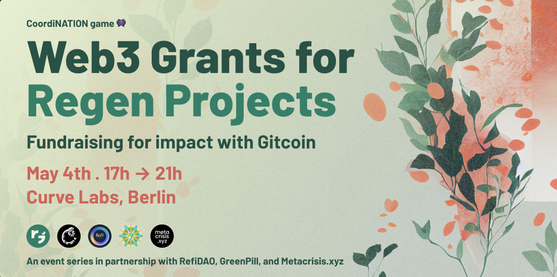 (May 4th, online): โTogether with Curve Labs, Regens Unite is hosting an evening to talk about an exciting way to fundraise for your impact project through the magic of Gitcoin's quadratic funding mechanism ๐ช