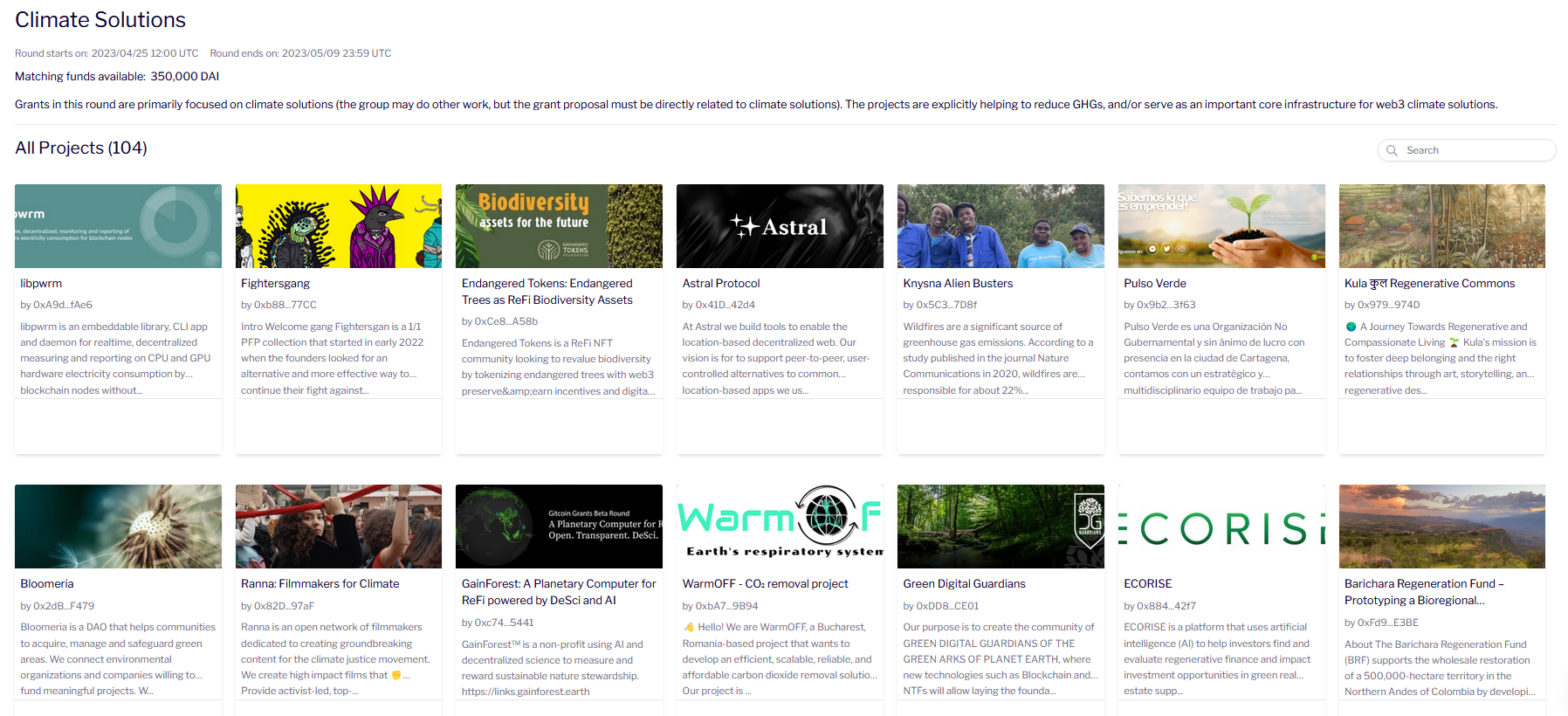 With one of the highest matching pools of $350k and 104 projects included, the Climate Solutions round gathered projects working on actively reducing greenhouse gas emissions (GHGs) or building foundational infrastructure for web3-based climate solutions. The Climate round received huge support from the community, gathering over $40k in donations.