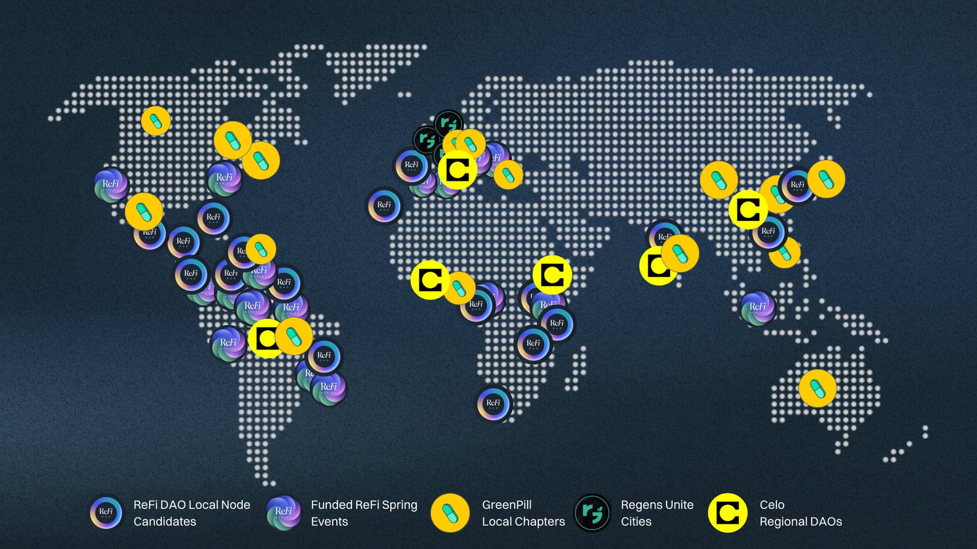 As well as ReFi DAO's efforts, GreenPill Network has been continuing to invest in it’s Local Chapters — a “CoordiNation across Nations & Cultures” that exports regenerative digital infrastructure to the world. At the same time, Celo Regional DAOs have been active since 2022 as a program to empower local communities to spearhead Celo adoption and growth in their region.