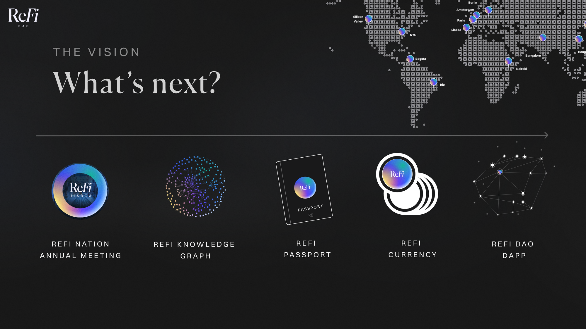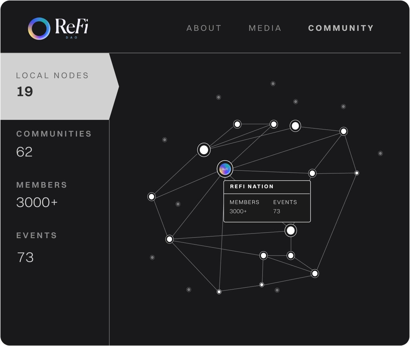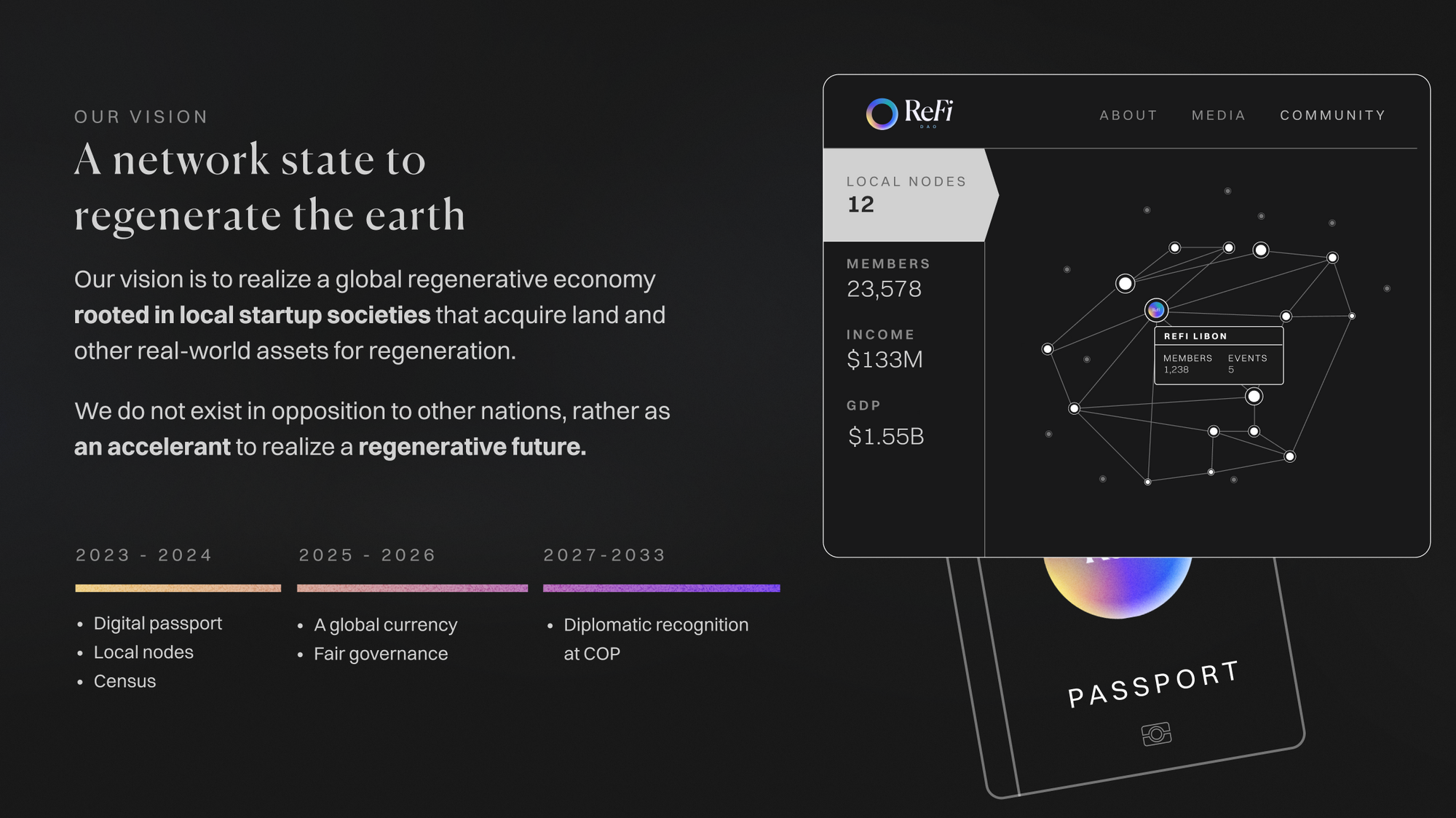 Taking this concept in a new direction, in February 2023 ReFi DAO announced a vision for a network state as a vehicle for planetary regeneration. The model imagined a globally dispersed, but deeply connected organization that takes form as a decentralized network of local startup communities with a mission to catalyze both inner and outer regeneration and pioneer a new paradigm.