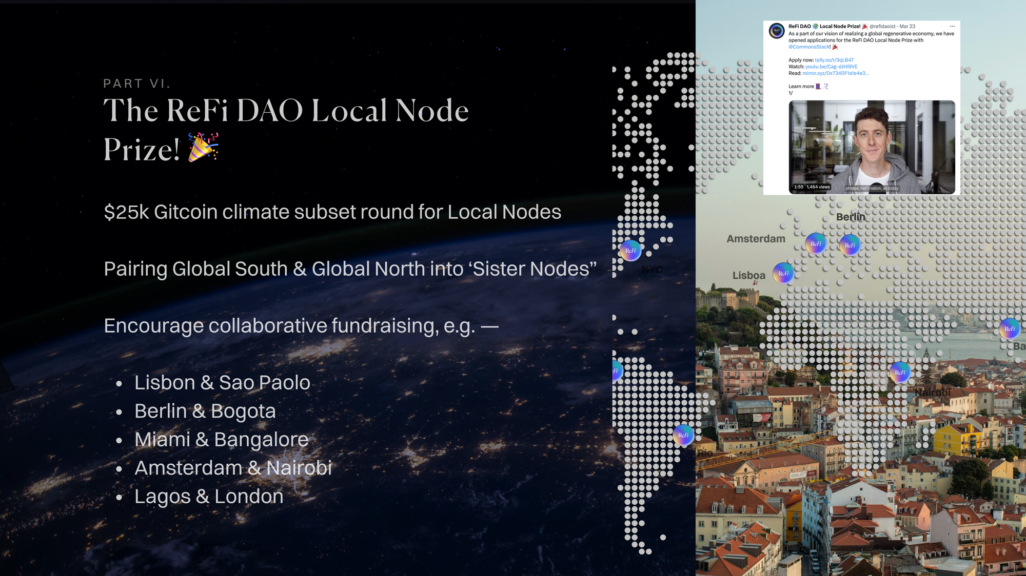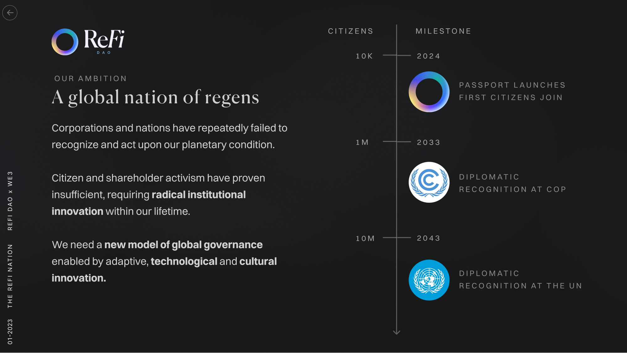 The idea was born out of a sobering observation: existing institutions β be they nation-states, corporations, or civil society β have persistently fallen short in tackling the pervasive threats of climate change and other critical challenges of our time. The urgency for a leap in innovation across cultural, social, economic, and technological domains is crystal clear. Driven by this realization, ReFi DAO formulated a mission to bring about a global regenerative economy, fostered by a transformative global network of mission aligned local communities.